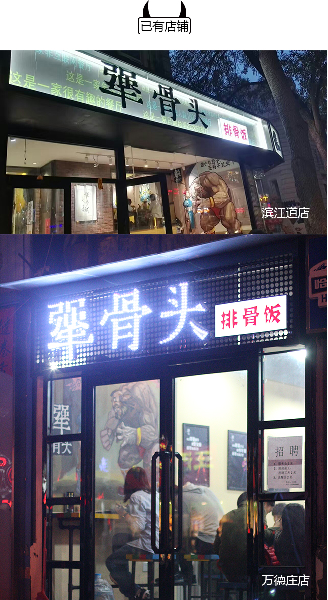 位于天津市重要商圈,计划于2016年11开业,产品类不仅包括三大明星还有新研发的当季新品,价格也是亲民,让客户用最实惠的价格吃到味道最好、量最多的排骨饭。开业营销活动:线上线下火力全开,如线下百人内部试吃、搭配节日的小活动等,线上自营平台、友情号、投资股东资源平台齐上阵,打造霸屏行动等。正式开业后,股东们每人每天举办一次跨界活动,让顾客、股东,每次都得到不一样的惊喜与收获,犟骨头就是不一样,不仅好吃、好玩更有料。